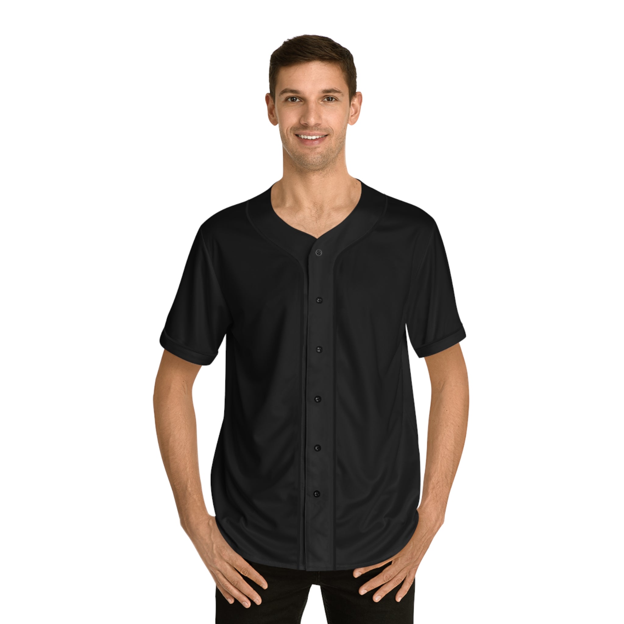 All-over prints make the crowd go wild - add yours now to this men's AOP baseball jersey & create an instant classic. Featuring a full-button front and a rounded hem, these tees feature moisture-wicking fabric that keeps you cool when under pressure. Choose between a white or black trim color and buttons, add your design, and make it uniquely yours. .: Material: 100% moisture-wicking polyester.: Extra light fabric (4.13 oz/yd² (140g/m²)).: Regular fit.: Trim color and buttons available in black or white